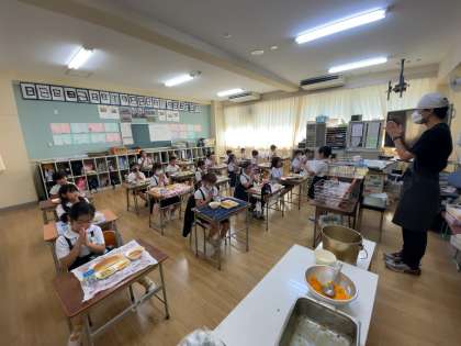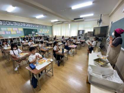 3年生の子どもたちはどのメニューもおいしそうに食べていました。まだ暑いので、さっぱりとしたみかんの缶詰が人気で、おかわりのじゃんけんに力が入っていました。