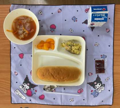 本日の献立は、コッペパン、いちごジャム、カレーマカロニグラタン、トマトスープ、みかんの缶詰、牛乳です。