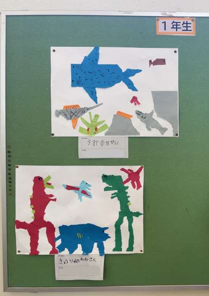 1年生は「ちぎり絵」で様々な世界を表現しました。