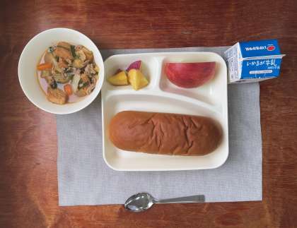 昨日の献立は、黒糖パン、中華煮、大学いも、りんご、牛乳です。