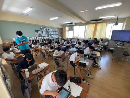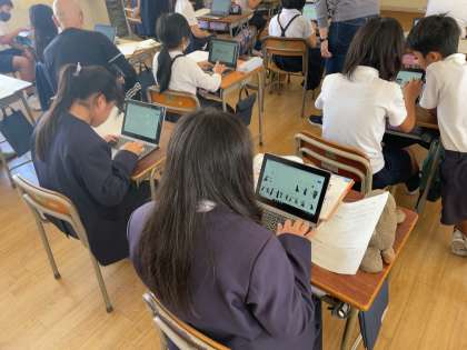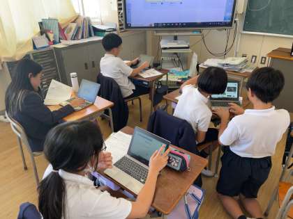 子どもたちは、学習者用端末を使って、あこがれている有名人について調べ、英発表ノートに英語でまとめていました。イラストを入れたり、文字の大きさや形を変えて飾りつけを上手にしていました。