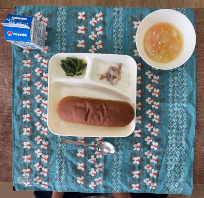 今日の献立は、黒糖パン、豚肉のガーリック焼き、鶏肉と野菜のスープ、さんどまめとコーンのソテー、牛乳です。