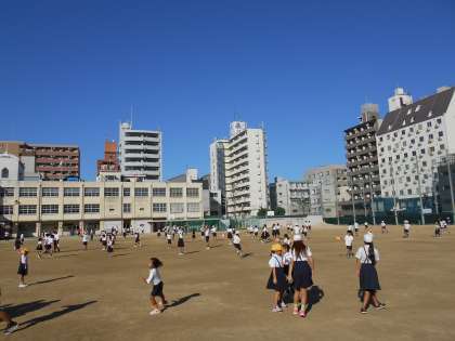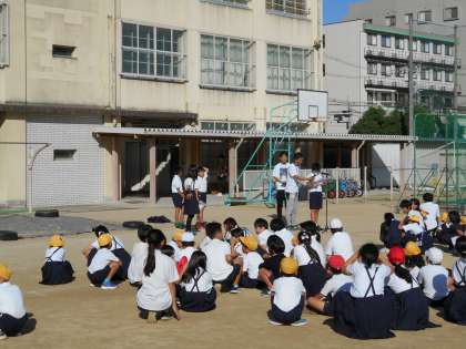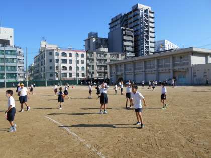 児童集会で「バナナおに」をしました。澄み切った秋空の下、低学年の児童が高学年の児童を追いかけたり、バナナになっている友だちを助けたりして、子どもたちは元気に楽しんでいました。