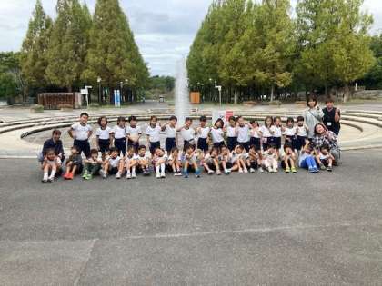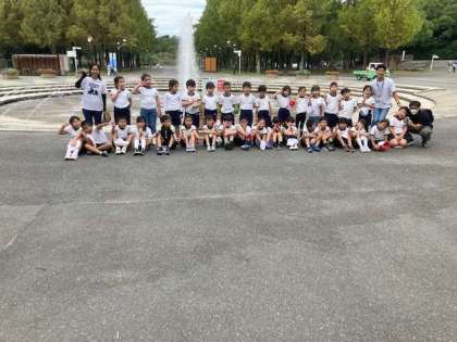 大阪メトロを乗り継いで無事、鶴見緑地公園に着きました。記念撮影してから、遊具で思いっきり遊ぶ予定です。