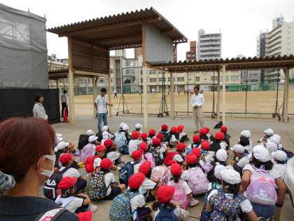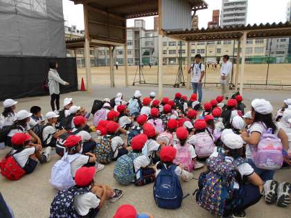 笑顔いっぱいで鶴見緑地公園から帰ってきました。おいしいお弁当を食べたこと、おやつの時間が楽しかったことなど、話してくれました。最後に校長先生からたくさん歩いたことをほめていただきました。