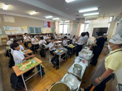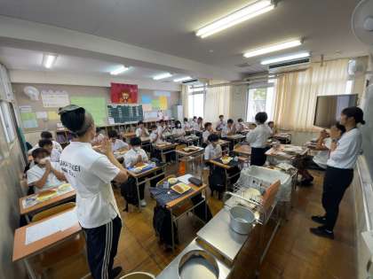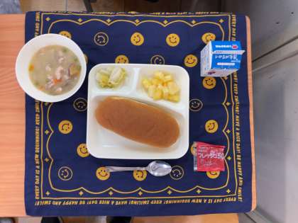 7年生の子どもたちはどのメニューもおいしそうに食べていました。とくに鶏肉とさつまいものシチューが人気でした。