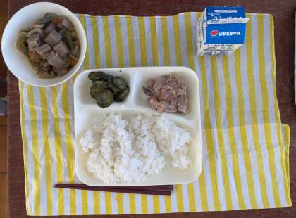本日の献立は、ごはん、豚肉のねぎじょうゆ焼き、ふきよせ煮、きゅうりの赤じそあえ、牛乳です。