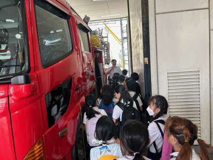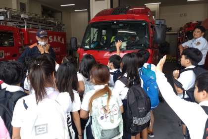 消防署員の皆様に、消防車を見せてもらったり、消防署員の勤務について聞かせてもらったりしました。2交代の24時間勤務でお仕事をしていることや、消防車が消火活動に行くときには絶対に水がなくならないようにする工夫など、教えていただきました。子どもたちはしっかりとお話を聞くことができました。