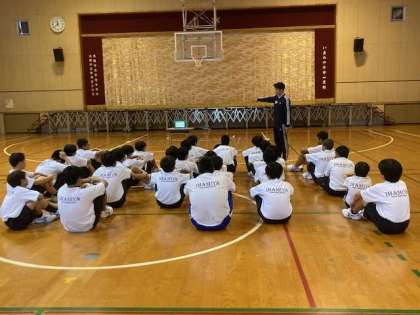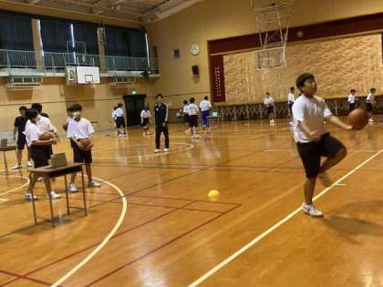 レイアップシュートを上手く決めるようになるため、パソコンを活用して自分のフォームをチェックしたり、班で注意点を確認したりしました。