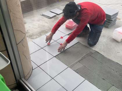 タイルの表面がでこぼこにならないように、3枚目の写真のタイルとタイルの間についている3つの赤いもの、高さをそろえるための治具を使って平らにします。