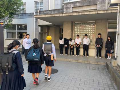 11月6日の朝は、委員のみなさんと一緒に、バスケットボール部が朝のあいさつ運動を行いました。