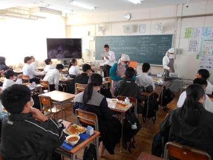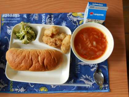 本日の献立は、おさつパン、白身魚フリッター、ミネストローネ、ブロッコリーのサラダ、牛乳です。7年生の子どもたちは、「いただきます」の挨拶をしておいしそうに食べていました。