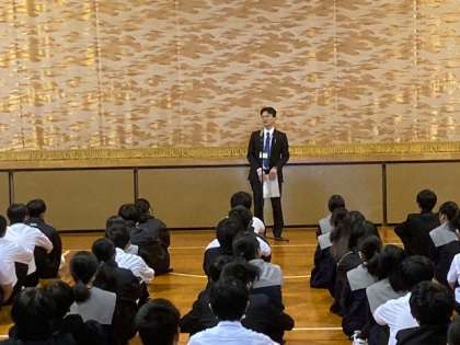 その後、生徒指導主事の先生より、「闇バイト」についてお話がありました。闇バイトは犯罪であり、応募をすると逃げることができない状態にされてしまいます。そうならないために、「甘い言葉や怪しい誘いには絶対にのらないこと」「お金を受け取るようなことは、必ず家族に相談すること」「犯人から脅されれば、すぐに家族や警察に相談すること」「警察は脅迫を受けた本人や家族を守ります」という内容でした。