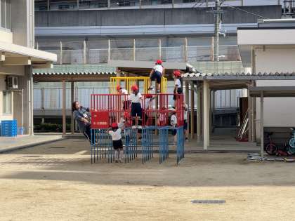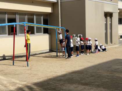 子どもたちは、うんていにぶら下がったり、片手ずつ進んだりしていました。ジャングルジムでは登ったり、ぶら下がったりしながら、一番上まで登ったりしていました。上り棒では、1本や2本の棒を使って上手に登り、上からパッと降りてきたりしていました。