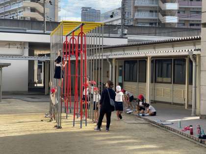 11月11日の1時間目の体育では、うんていやジャングルジム、登り棒を使って、「いろいろな遊具で遊ぼう」を行いました。