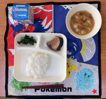 本日の献立は、ごはん、なまりぶしのしょうが煮、なめこのみそ汁、ほうれんそうのごまあえ、牛乳です。