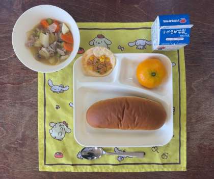 本日の献立は、黒糖パン、豚肉と野菜のスープ煮、変わりピザ、みかん、牛乳です。