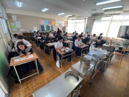 8年生の子どもたちはどのメニューもおいしそうに食べていました。今日は寒いので暖かい鶏肉ときのこのシチューがうれしかったようです。
