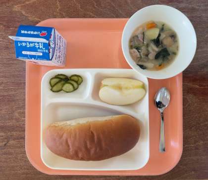 本日の献立は、黒糖パン、鶏肉ときのこのシチュー、きゅうりのピクルス、りんご、牛乳です。