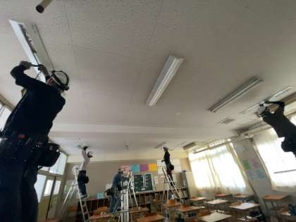 ご覧のように、1つの教室に作業に6人、資材の運搬に1〜2人のチームを組んで、1時間もたたないうちに交換が進んでいきます。この工事は、12月6日まで続きます。体育館や格技室の含めて交換します。