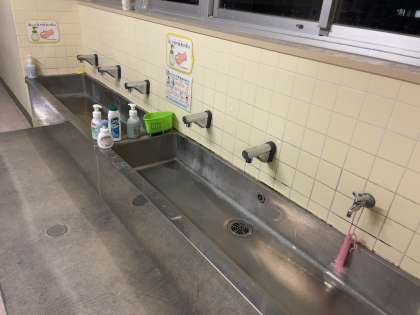 学校内の蛍光灯をLED照明に交換することと、手洗い場の蛇口を自動水栓化する工事が始まりました。