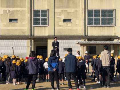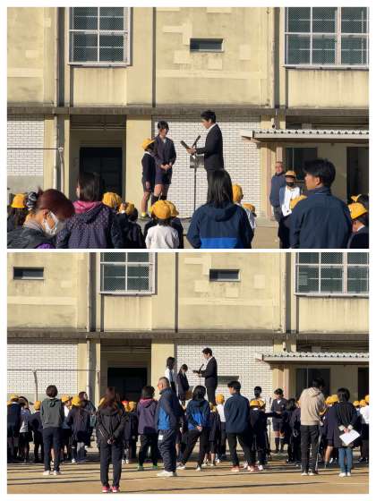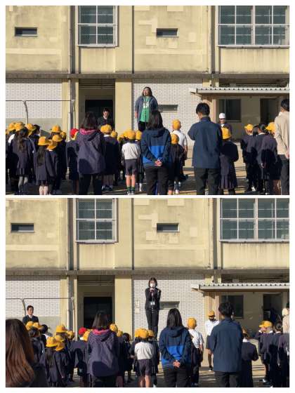 風があまりなく、日光で少し暖かく感じる中で小学校朝会が行われました。