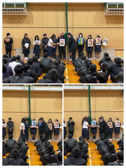 最初に児童会・生徒会から、先日行われた赤い羽根共同募金の集計発表と、西成区社会福祉協議会の方への募金贈呈が行われました。募金は昨年度を上回り、3,3000円以上集まりました。これらは、子ども食堂の運営資金等に活用されるそうです。各家庭からのご協力、本当にありがとうございました。