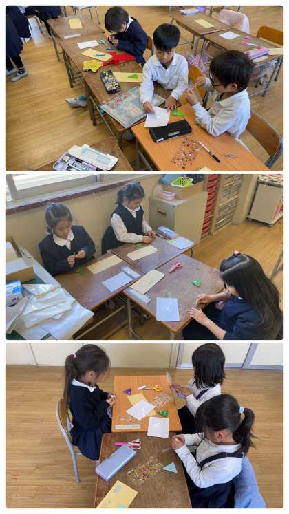 12月19日の5時間目の生活の授業で、クラスで行うクリスマスプレゼント交換のプレゼントを作りました。