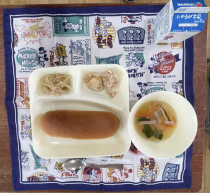 本日の献立は、黒糖パン、鶏肉のから揚げ、ハムと野菜の中華スープ、もやしとコーンの中華あえ、牛乳です。