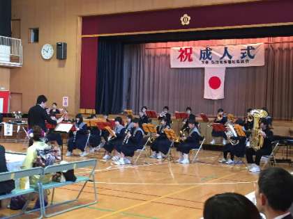 11日成人の日、もと弘治小学校で弘治成人式が行われ、本校吹奏楽部の演奏で始まりました。