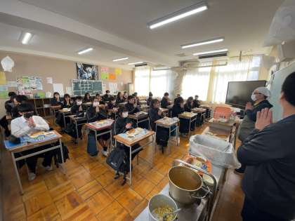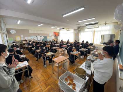 9年生の子どもたちはどのメニューもおいしそうに食べていました。特に、おさつパン、ビーフシチューが人気でした。