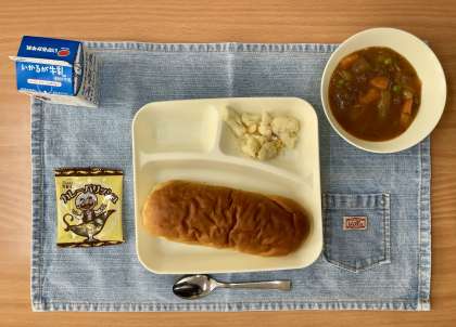 本日の献立は、おさつパン、ビーフシチュー、カリフラワーとコーンのサラダ、カレーフィッシュ、牛乳です。