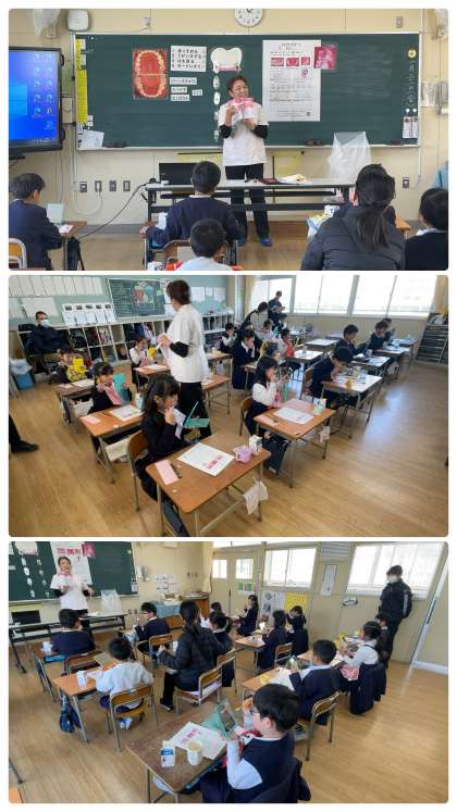 1月31日の2・3時間目で、2年生は歯科衛生士さんから歯磨き指導をして頂きました。