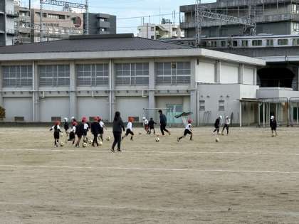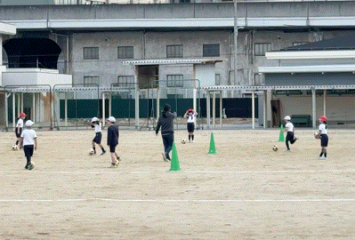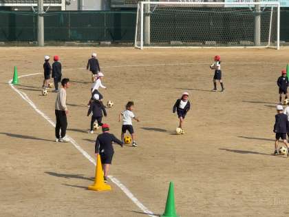 子どもたちは赤チームと白チームに分かれて、ボールタッチなどの練習をしました。