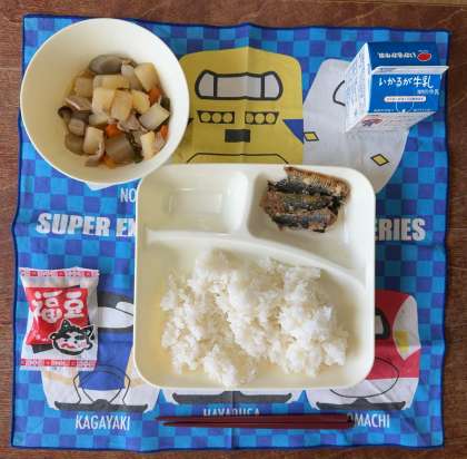 本日の献立は、ごはん、いわしのしょうがじょうゆがけ、含め煮、入り大豆、牛乳です。中学生は焼きのりが付きます。