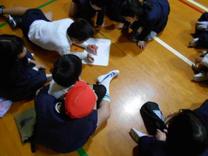 今日の児童集会は「曲名当てクイズ」でした。集会委員会が音楽を流し、聞いた曲をたてわり班のメンバーで相談して考えていました。そして、わかった曲の題名をホワイトボードに書いてみんなに見せていました。聞いたことがある曲が流れると、「わかった」「あの曲や」と言って盛り上がっていました。