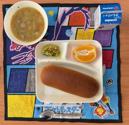 本日の献立は、黒糖パン、ポトフ、カレーソテー、いよかん、牛乳です。