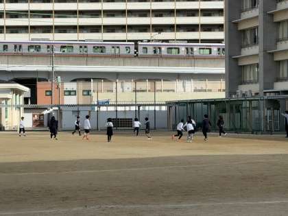 子どもたちは、担任の先生もいっしょになって、みんなで楽しくサッカーをしていました。