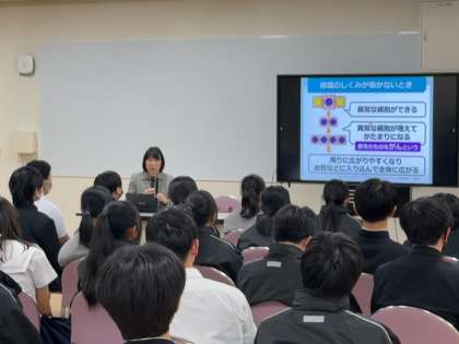 本日は、講師の先生をお招きしての授業となります。子どもたちは講師の先生の話を真剣に聞き、がんについて正しく理解し、健康と命の大切さについて学びました。