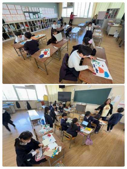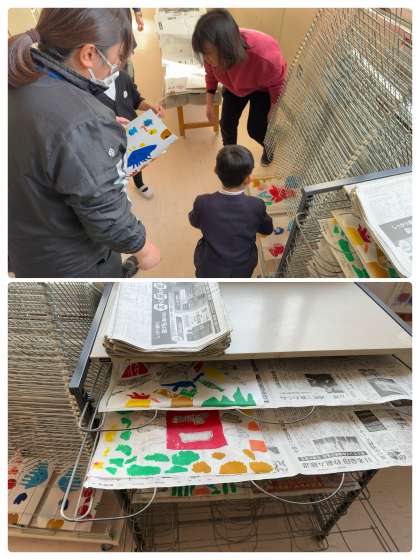 子どもたちは、位置合わせなどに気を使いながら慎重に作業をし、できあがった版画を嬉しそうに乾燥棚に乗せていました。
