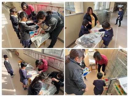 今まで、いろタック(絵の具が表面についたシール紙)を使って、様々な絵を作っていました。今日は、すりとり紙(和紙)を水で濡らし、いろタックで作った判に乗せ、バレンでこすり、色を写し取りました。