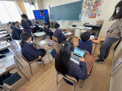 子どもたちは、紹介したい都市についてインターネットで調べ、その内容を英語にしていました。
