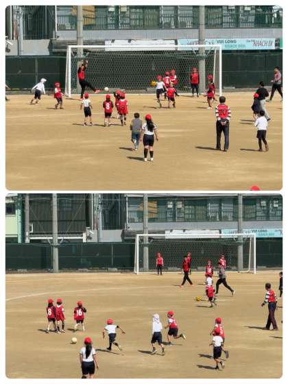 子どもたちは休み時間と違って、全面で大きなゴールが使えるとあって、先生と一緒にみんなでたくさん走ってボールを追いかけていました。