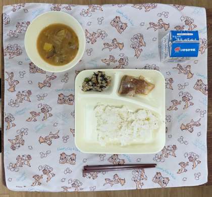 本日の献立は、ごはん、あかうおのレモンじょうゆかけ、さつまいものみそ汁、高野どうふのいり煮、牛乳です。