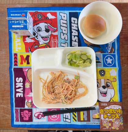 本日の献立は、ミニコッペパン、さけのクリームスパゲッティ、キャベツときゅうりのサラダ、おさつチップス、牛乳です。