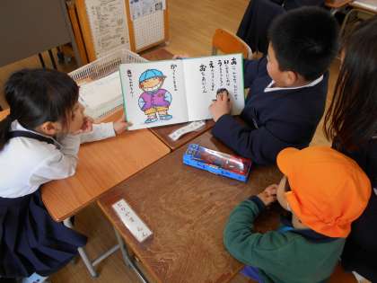 わかくさ保育園の園児の皆さんが、1年生の教室に入って小学生体験を行いました。1年生が園児の皆さんに塗り絵を教えてあげたり、本を読み聞かせたりしていました。1年生の皆さんはとても上手に本を読み、園児の皆さんもしっかり聞いていました。どの子どもたちも優しくお世話をしてくれていました。