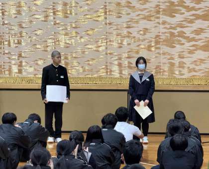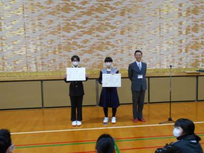 3月10日の月曜日朝、体育館で中学校全校集会が行われました。