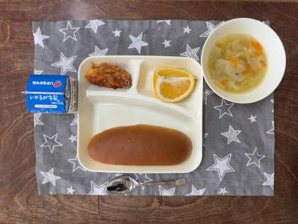 本日の献立は、黒糖パン、とうふのミートグラタン、じゃがいもと野菜のスープ、はっさく、牛乳です。