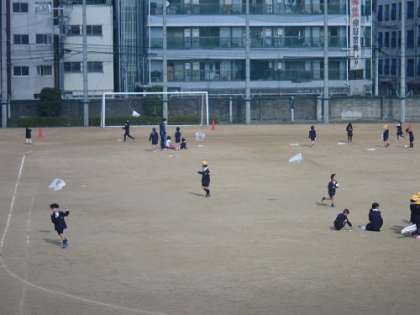 1年生が運動場でたこあげをしていました。広い運動場をたこが少しでも高く舞い上がるように、子どもたちは元気に走っていました。