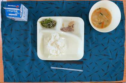 本日の献立は、ごはん、豚肉のしょうが焼き、とうふのみそ汁、じゃこピーマン、牛乳です。